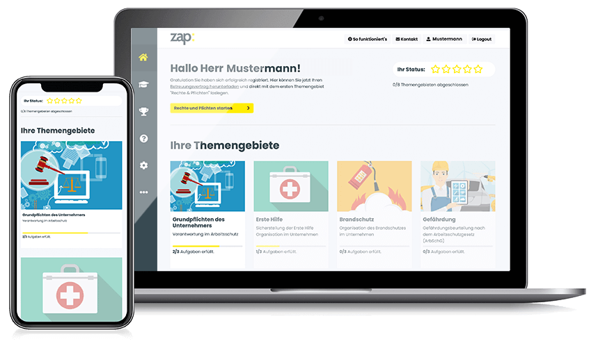 Nachdem Sie Ihren Betreuungsvertrag erhalten haben, bietet Ihnen ZAP über das Online Portal die Möglichkeit, Wissen in allen relevanten Themenbereichen des Arbeits- und Gesundheitsschutzes zu erlangen und eigene Lösungen für Ihr Unternehmen abzuleiten. Mithilfe von benutzerfreundlichen Online-Modulen absolvieren Sie verschiedene Themenbereiche, die Sie mit Ihrem ganz persönlichen Arbeitsschutz-Zertifikat abschließen. Bei besonderen Herausforderungen können Sie jederzeit auf unsere Experten zurückgreifen und sich bei der Arbeit unterstützen lassen. ZAP - Arbeitsmedizin & Arbeitssicherheit. direkt. online.